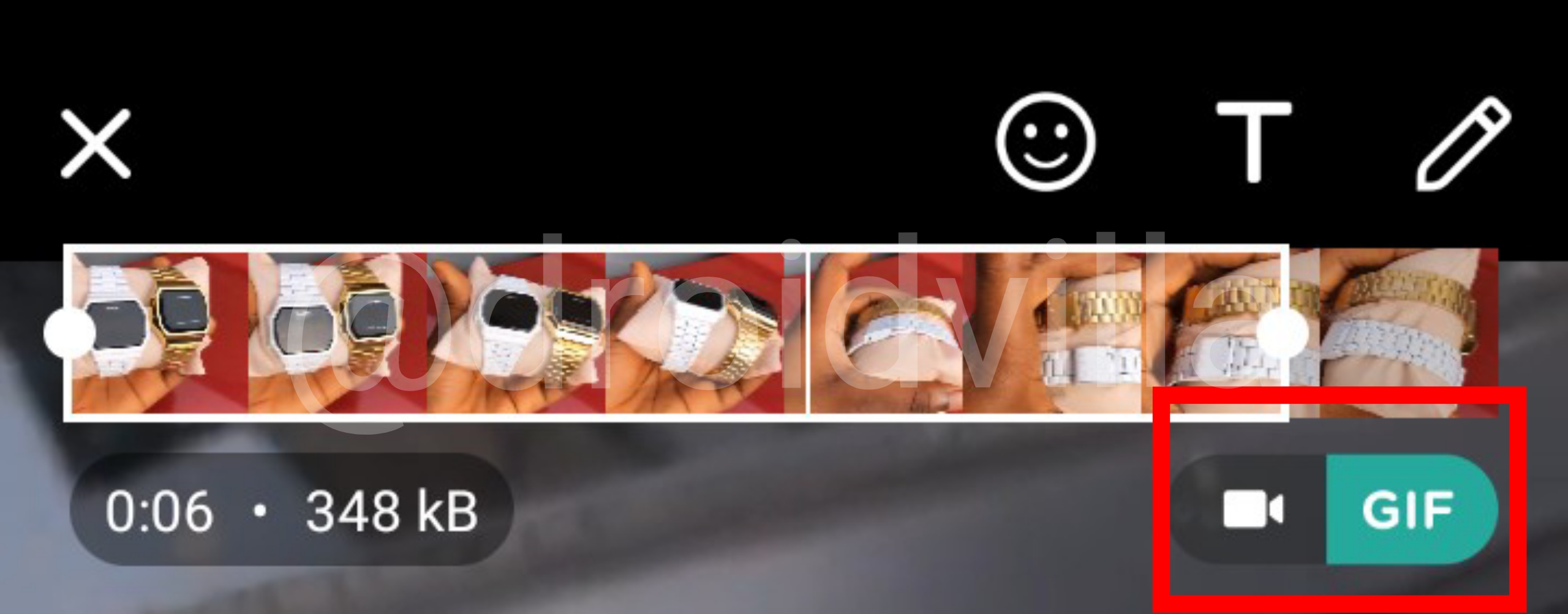 Whatsapp gif converter - At the exact 6 seconds of the adjustment, you will see an option to switch between video to gif at the top right side of the screen.