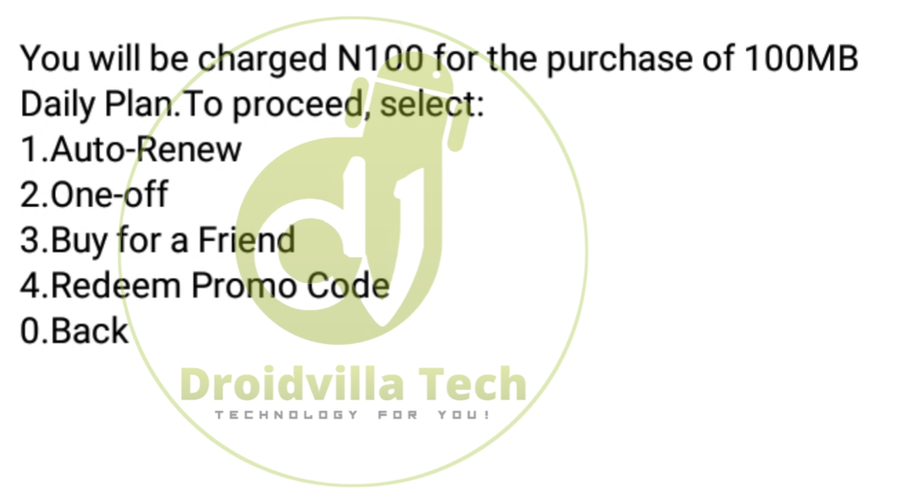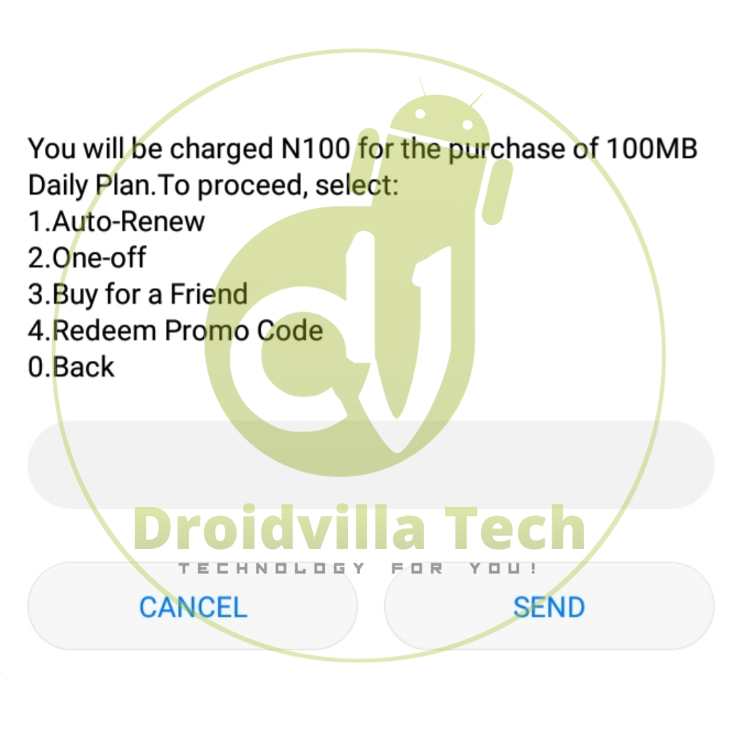 To Activate or get this MTN 100mb for N100 daily data subscription plan, simply dial ussd code *131*104# and select option 2 for one time renewal or you select option 1 for auto renewal of the daily 100mb for N100. Ypu can aswell select option 3 if you wish to gift this plan to a friend or family member.
